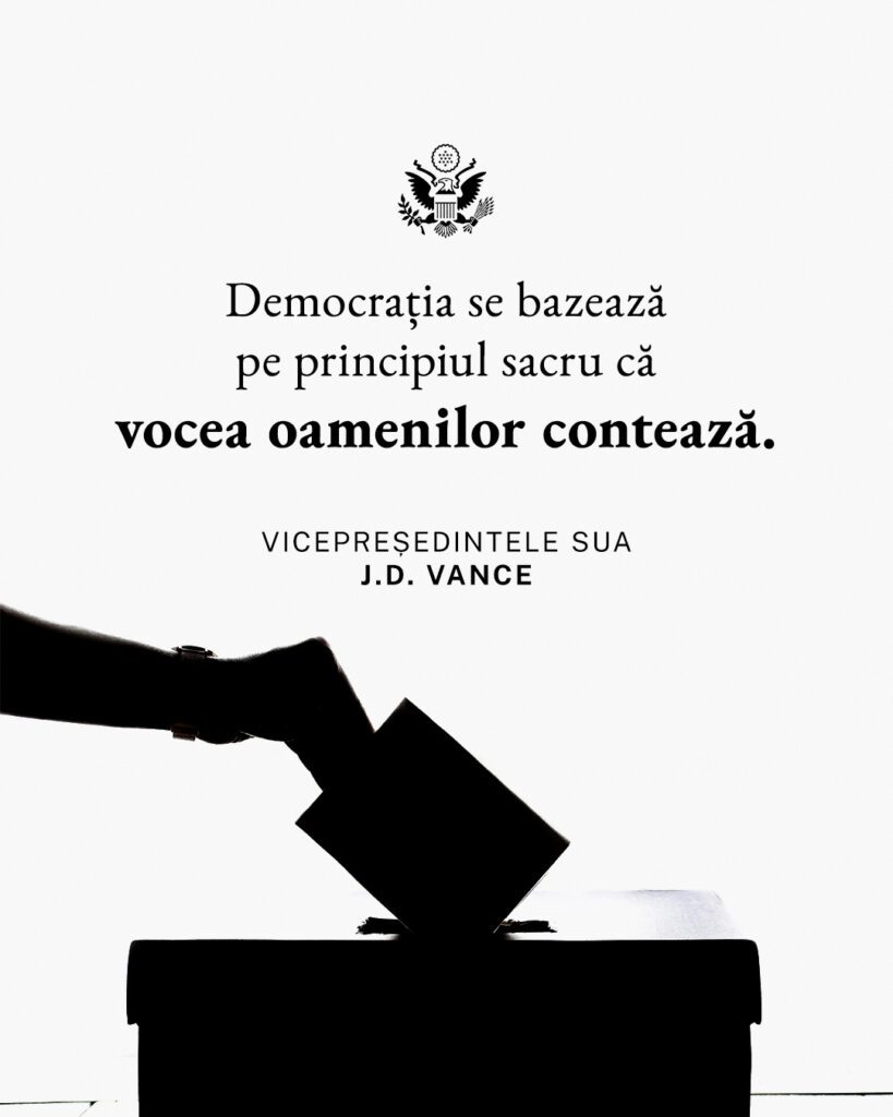 Iar imaginea care însoțește textul conține un citat din vicepreședintele J.D.Vance ”Democrația se bazează pe principiul sacru că vocea oamenilor contează”.
