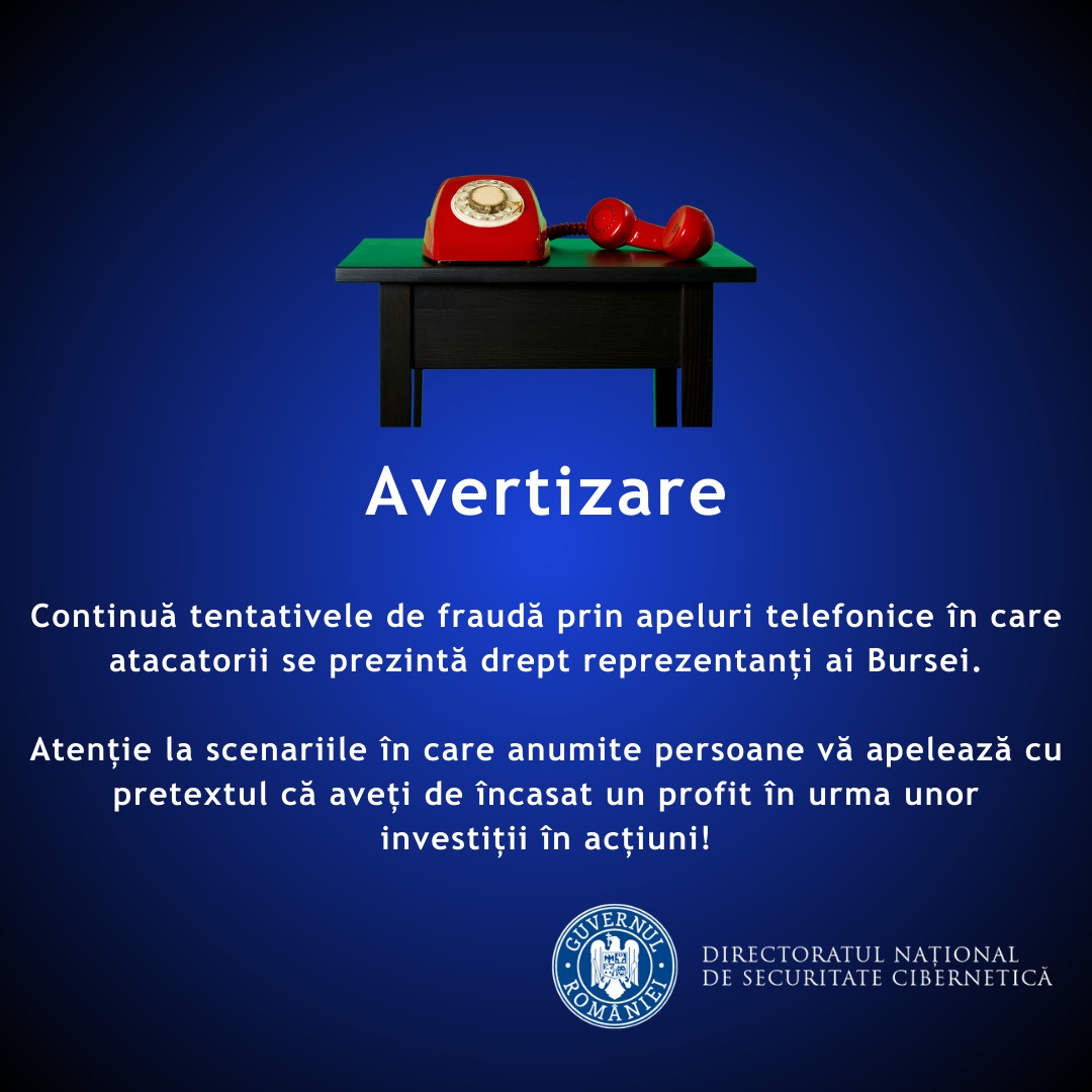 The post Avertisment DNSC: Continuă campania de fraudă din partea unor infractori care se deghizează în reprezentanţi ai Bursei din România appeared first on News Bucuresti.