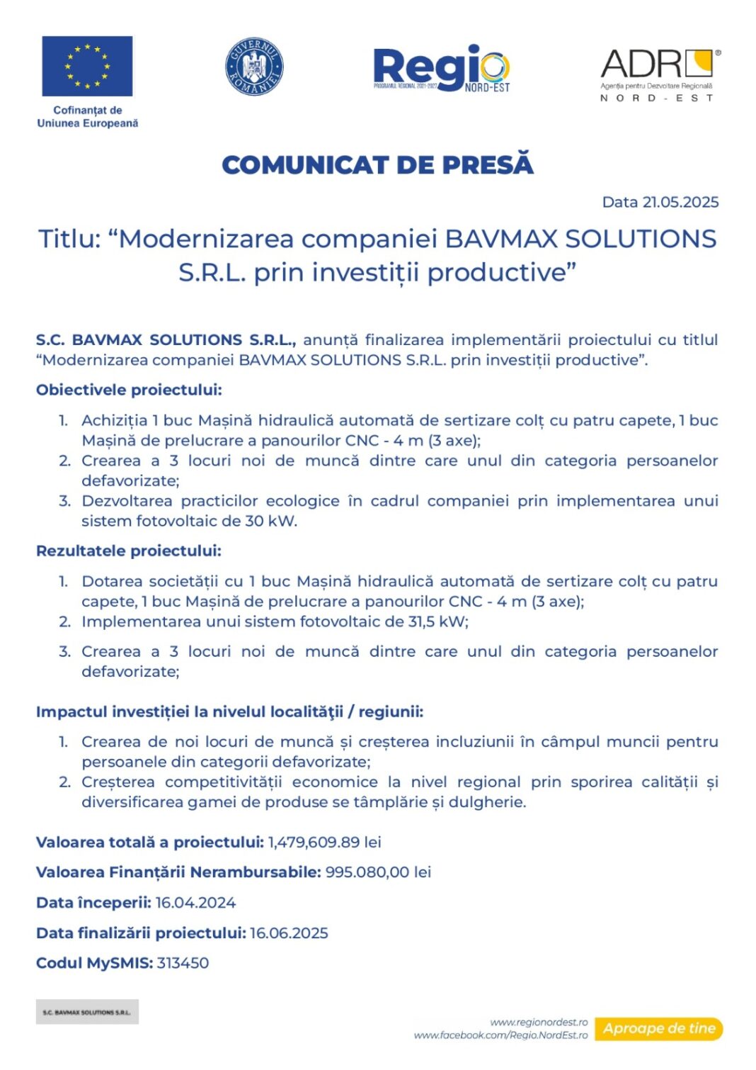 Comunicat de Presă privind finalizarea proiectului “Modernizarea companiei BAVMAX SOLUTIONS S.R.L. prin investiții productive”