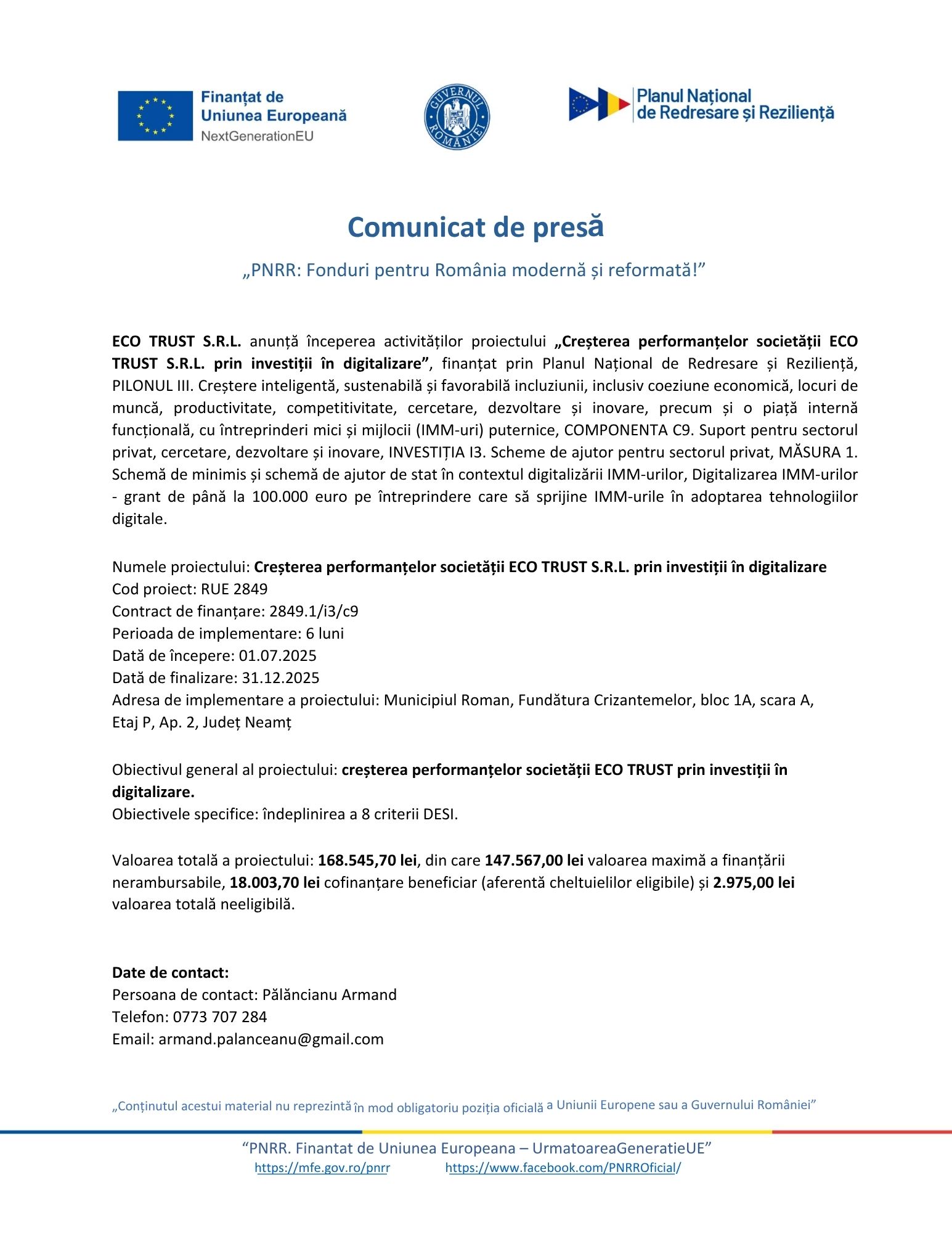 ECO TRUST S.R.L. anunță începerea activităților proiectului „Creșterea performanțelor societății ECO TRUST S.R.L. prin investiții în digitalizare”, finanțat prin Planul Național de Redresare și Reziliență, PILONUL III. Creștere inteligentă, sustenabilă și favorabilă incluziunii, inclusiv coeziune economică, locuri de muncă, productivitate, competitivitate, cercetare, dezvoltare și inovare, precum și o piață internă funcțională, cu întreprinderi mici și mijlocii (IMM-uri) puternice, COMPONENTA C9. Suport pentru sectorul privat, cercetare, dezvoltare și inovare, INVESTIȚIA I3. Scheme de ajutor pentru sectorul privat, MĂSURA 1. Schemă de minimis și schemă de ajutor de stat în contextul digitalizării IMM-urilor, Digitalizarea IMM-urilor – grant de până la 100.000 euro pe întreprindere care să sprijine IMM-urile în adoptarea tehnologiilor digitale.