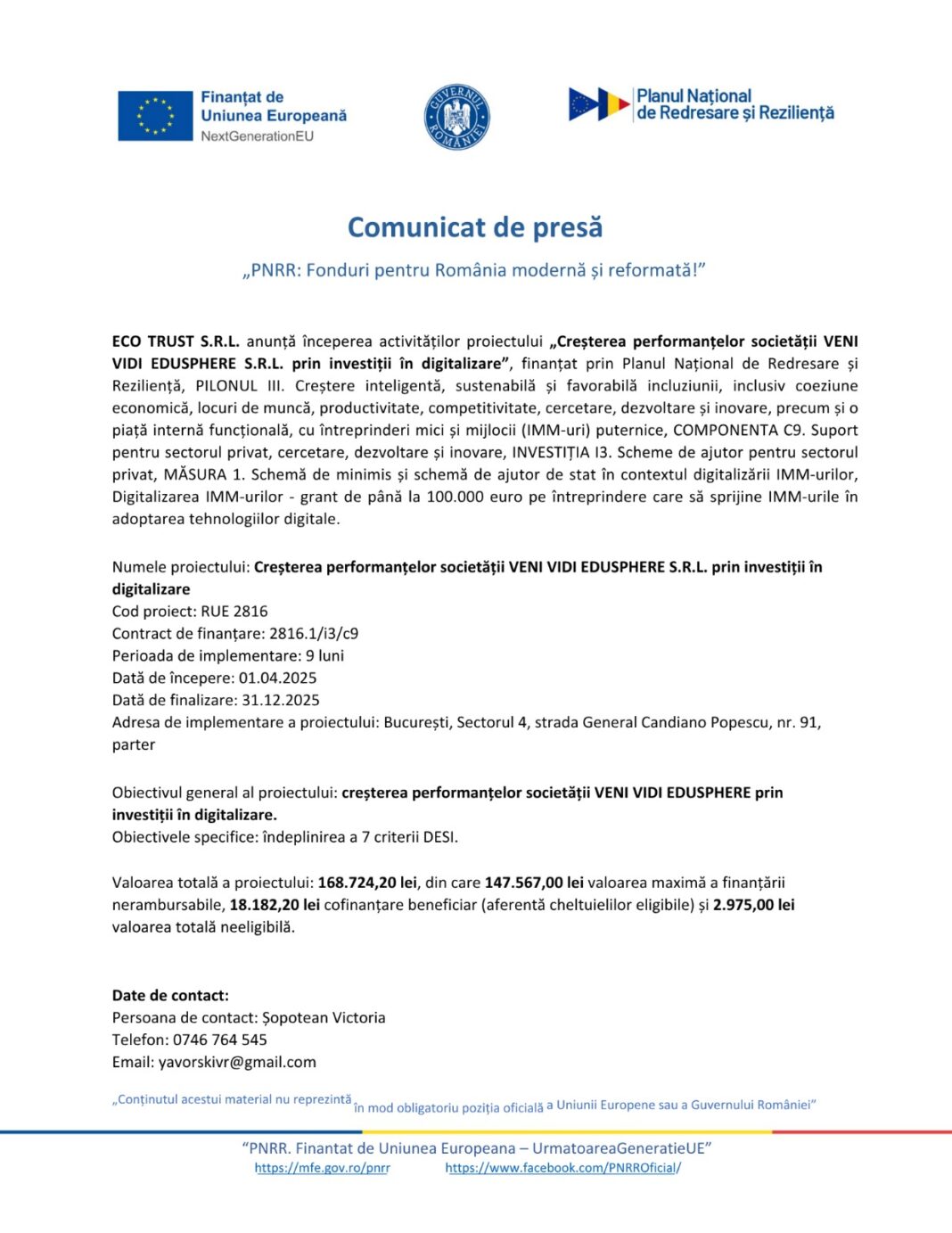 VENI VIDI EDUSPHERE S.R.L. anunță începerea activităților proiectului „Creșterea performanțelor societății VENI VIDI EDUSPHERE S.R.L. prin investiții în digitalizare”, finanțat prin Planul Național de Redresare și Reziliență, PILONUL III. Creștere inteligentă, sustenabilă și favorabilă incluziunii, inclusiv coeziune economică, locuri de muncă, productivitate, competitivitate, cercetare, dezvoltare și inovare, precum și o piață internă funcțională, cu întreprinderi mici și mijlocii (IMM-uri) puternice, COMPONENTA C9. Suport pentru sectorul privat, cercetare, dezvoltare și inovare, INVESTIȚIA I3. Scheme de ajutor pentru sectorul privat, MĂSURA 1. Schemă de minimis și schemă de ajutor de stat în contextul digitalizării IMM-urilor, Digitalizarea IMM-urilor – grant de până la 100.000 euro pe întreprindere care să sprijine IMM-urile în adoptarea tehnologiilor digitale.