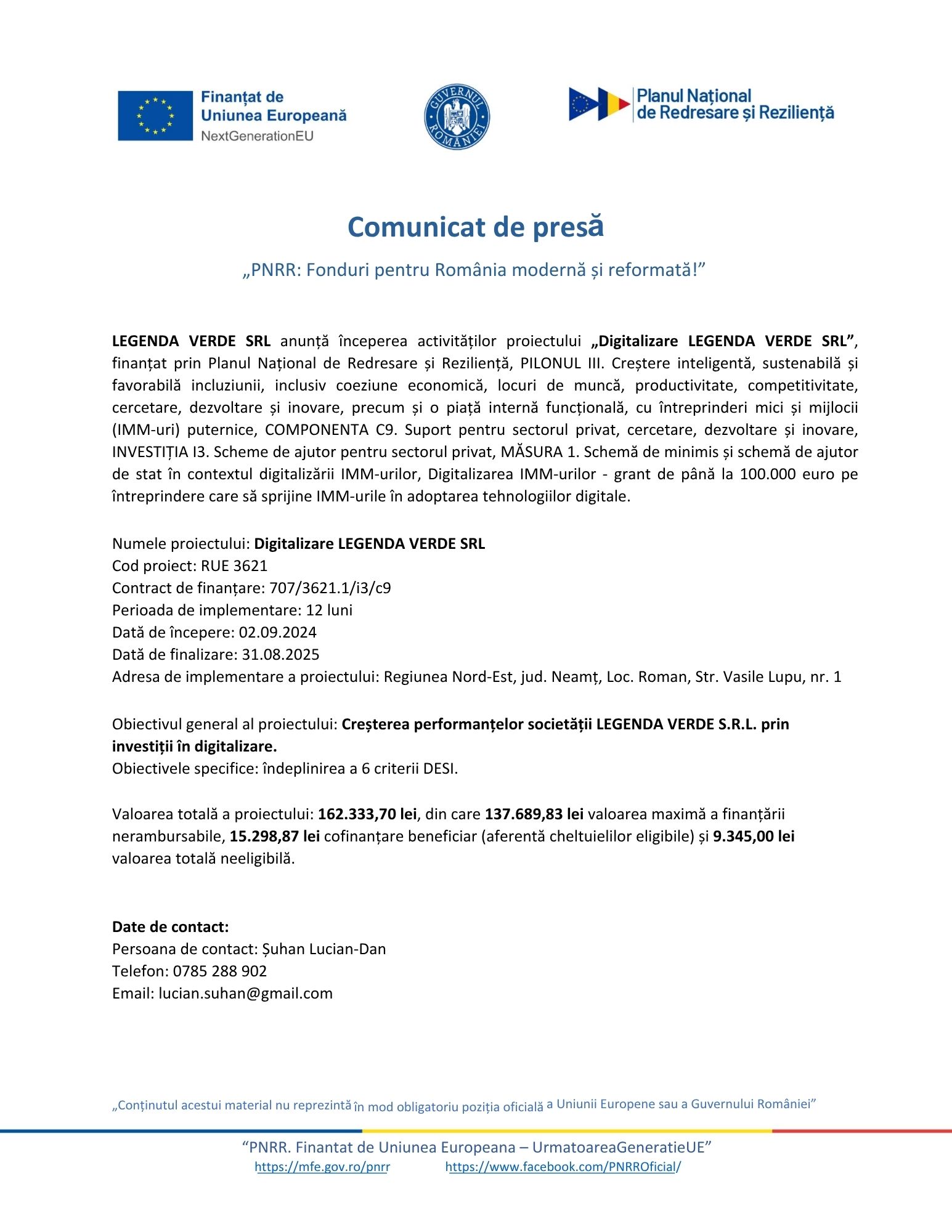 LEGENDA VERDE SRL anunță începerea activităților proiectului „Digitalizare LEGENDA VERDE SRL”, finanțat prin Planul Național de Redresare și Reziliență, PILONUL III. Creștere inteligentă, sustenabilă și favorabilă incluziunii, inclusiv coeziune economică, locuri de muncă, productivitate, competitivitate, cercetare, dezvoltare și inovare, precum și o piață internă funcțională, cu întreprinderi mici și mijlocii (IMM-uri) puternice, COMPONENTA C9. Suport pentru sectorul privat, cercetare, dezvoltare și inovare, INVESTIȚIA I3. Scheme de ajutor pentru sectorul privat, MĂSURA 1. Schemă de minimis și schemă de ajutor de stat în contextul digitalizării IMM-urilor, Digitalizarea IMM-urilor – grant de până la 100.000 euro pe întreprindere care să sprijine IMM-urile în adoptarea tehnologiilor digitale.
