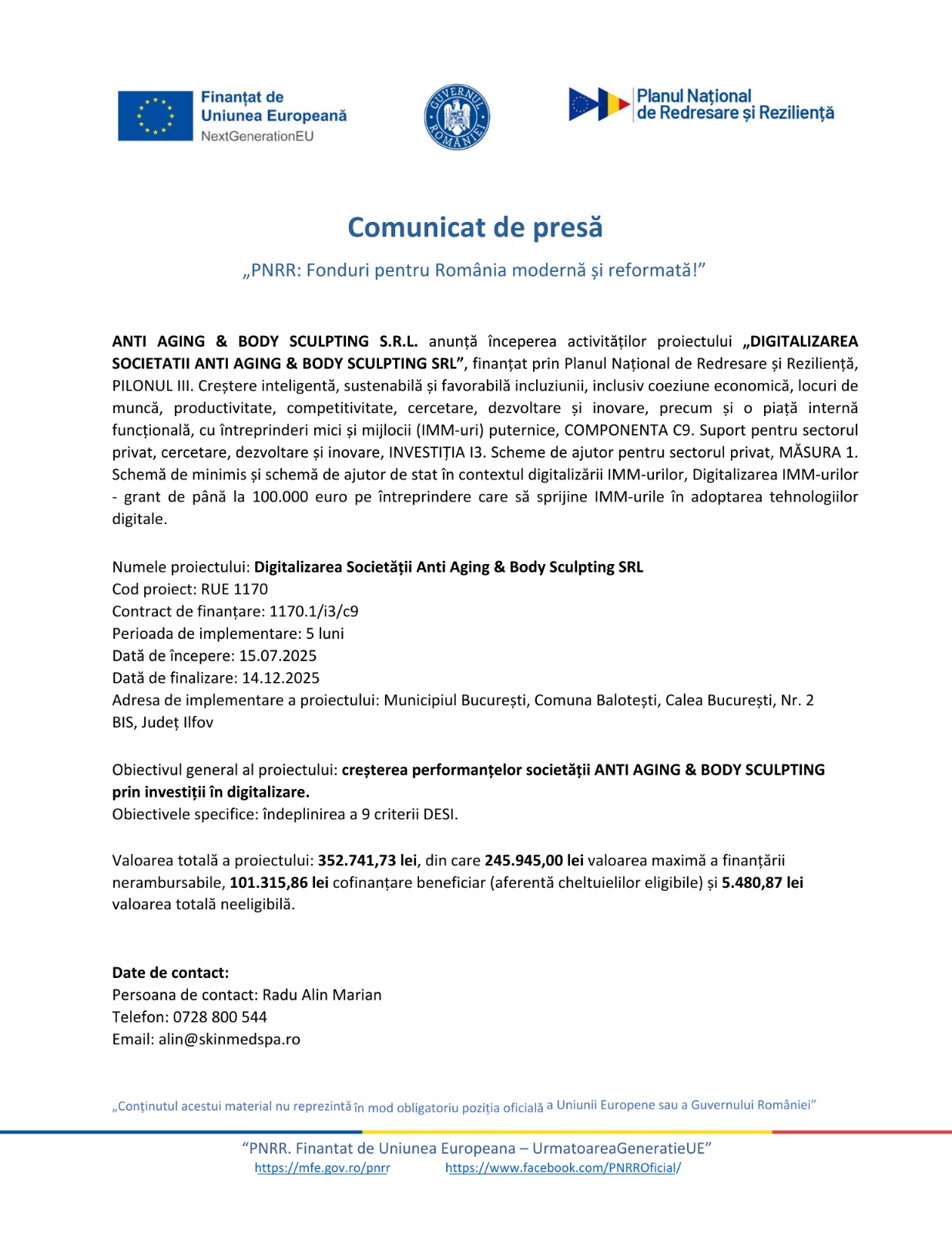 ANTI AGING & BODY SCULPTING S.R.L. anunță începerea activităților proiectului „DIGITALIZAREA SOCIETATII ANTI AGING & BODY SCULPTING SRL”, finanțat prin Planul Național de Redresare și Reziliență, PILONUL III. Creștere inteligentă, sustenabilă și favorabilă incluziunii, inclusiv coeziune economică, locuri de muncă, productivitate, competitivitate, cercetare, dezvoltare și inovare, precum și o piață internă funcțională, cu întreprinderi mici și mijlocii (IMM-uri) puternice, COMPONENTA C9. Suport pentru sectorul privat, cercetare, dezvoltare și inovare, INVESTIȚIA I3. Scheme de ajutor pentru sectorul privat, MĂSURA 1. Schemă de minimis și schemă de ajutor de stat în contextul digitalizării IMM-urilor, Digitalizarea IMM-urilor – grant de până la 100.000 euro pe întreprindere care să sprijine IMM-urile în adoptarea tehnologiilor digitale.