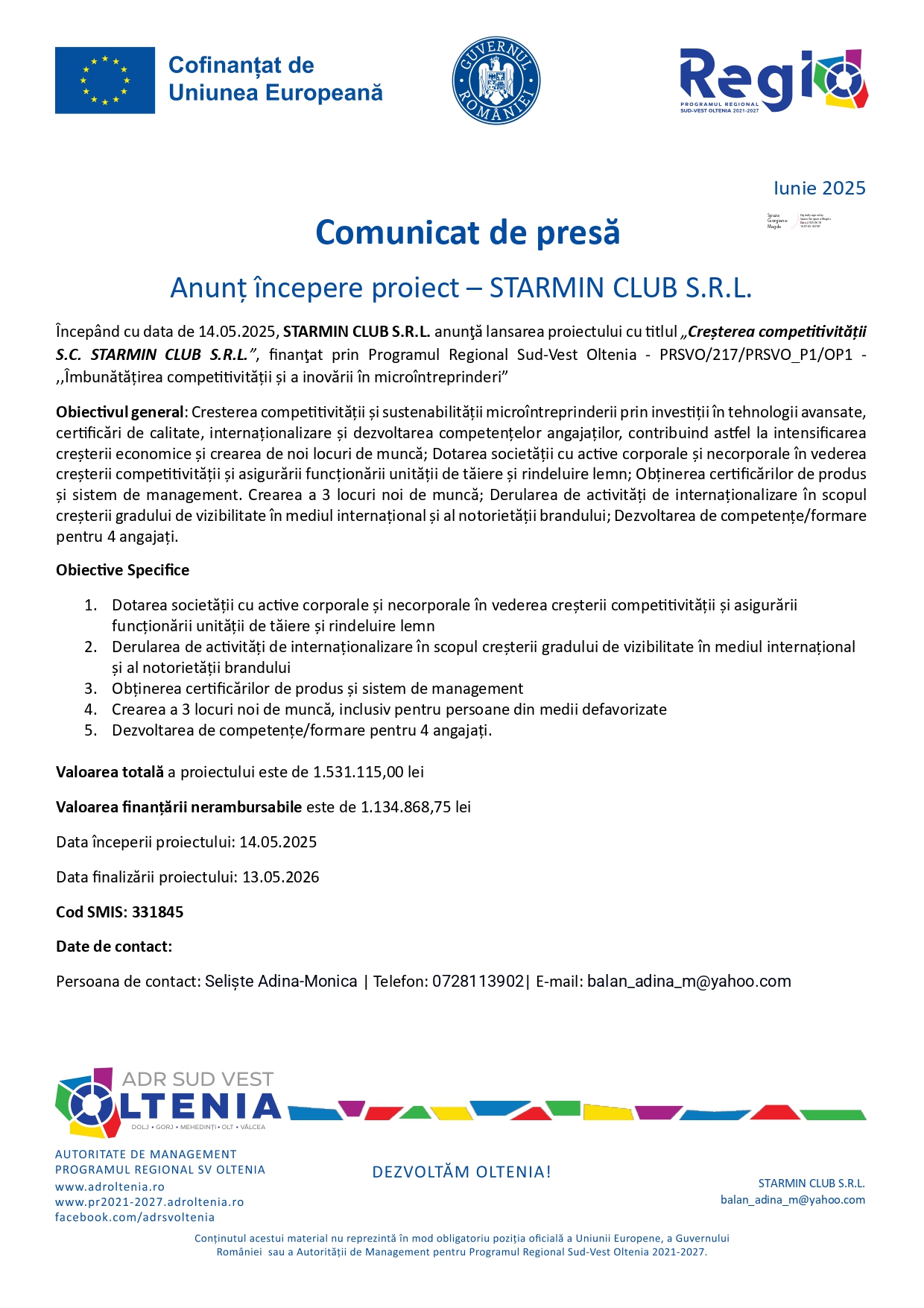 S.C. STARMIN CLUB S.R.L.”, finanţat prin Programul Regional Sud-Vest Oltenia – PRSVO/217/PRSVO_P1/OP1 –