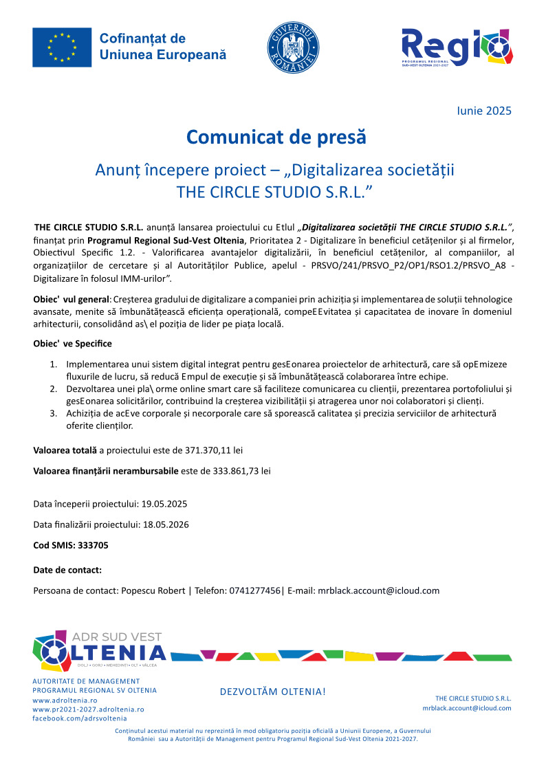 THE CIRCLE STUDIO S.R.L. anunţă lansarea proiectului cu titlul „Digitalizarea societății THE CIRCLE STUDIO S.R.L.”, finanţat prin Programul Regional Sud-Vest Oltenia, Prioritatea 2 – Digitalizare în beneficiul cetățenilor și al firmelor, Obiectivul Specific 1.2. – Valorificarea avantajelor digitalizării, în beneficiul cetățenilor, al companiilor, al organizațiilor de cercetare și al Autorităților Publice, apelul – PRSVO/241/PRSVO_P2/OP1/RSO1.2/PRSVO_A8 – Digitalizare în folosul IMM-urilor”.