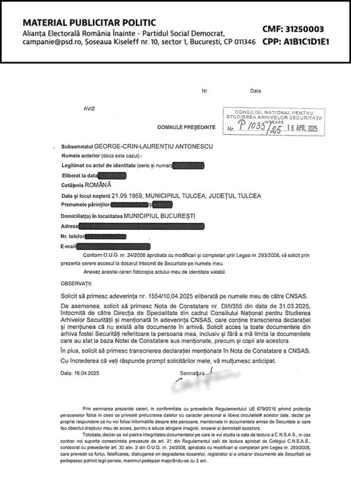 Crin Antonescu, candidatul alianței PSD-PNL-UDMR minorități la alegerile prezidențiale anunță că în urma atacului de ieri, a depus astăzi solicitarea către CNSAS pentru a primi toate documentele din dosarul meu legat de fosta Securitate.