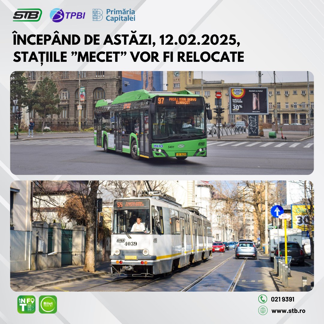 Stațiile „Mecet” de pe strada Traian vor fi relocate, anunță TPBI. Măsura este luată de astăzi, 12 februarie, pentru o legatură mai bună între liniile de tramvai 14 și 55 şi linia de troleibuz 97. Stațiile „Mecet” de pe strada Traian, relocate pentru o transbordare facilă între troleibuz și tramvai. Pentru asigurarea unei transpordări mai […]