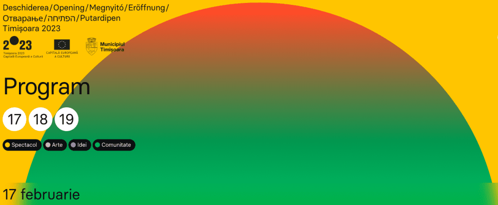Invitații vor participa de la ora 17:30 la un concert festiv la Palatul Culturii, iar de la ora 19:00 se vor alătura evenimentului principal din Piața Unirii, “Sărbătorim Deschiderea”, la care sunt așteptați până la 15.000 timișoreni și vizitatori.