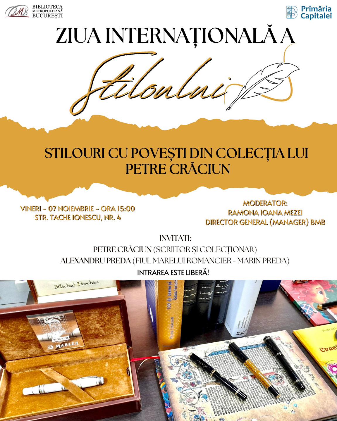 Primăria Municipiului București, prin Biblioteca Metropolitană București, organizează vineri, ora 15:00, la Sediul Central „Mihail Sadoveanu” (str. Tache Ionescu nr. 4), un eveniment dedicat eleganței scrisului și pasiunii pentru obiecte care spun povești: „Stilouri cu povești – din colecția lui Petre Crăciun”. Expoziția reunește o selecție de stilouri cu valoare literară și istorică, care au […]