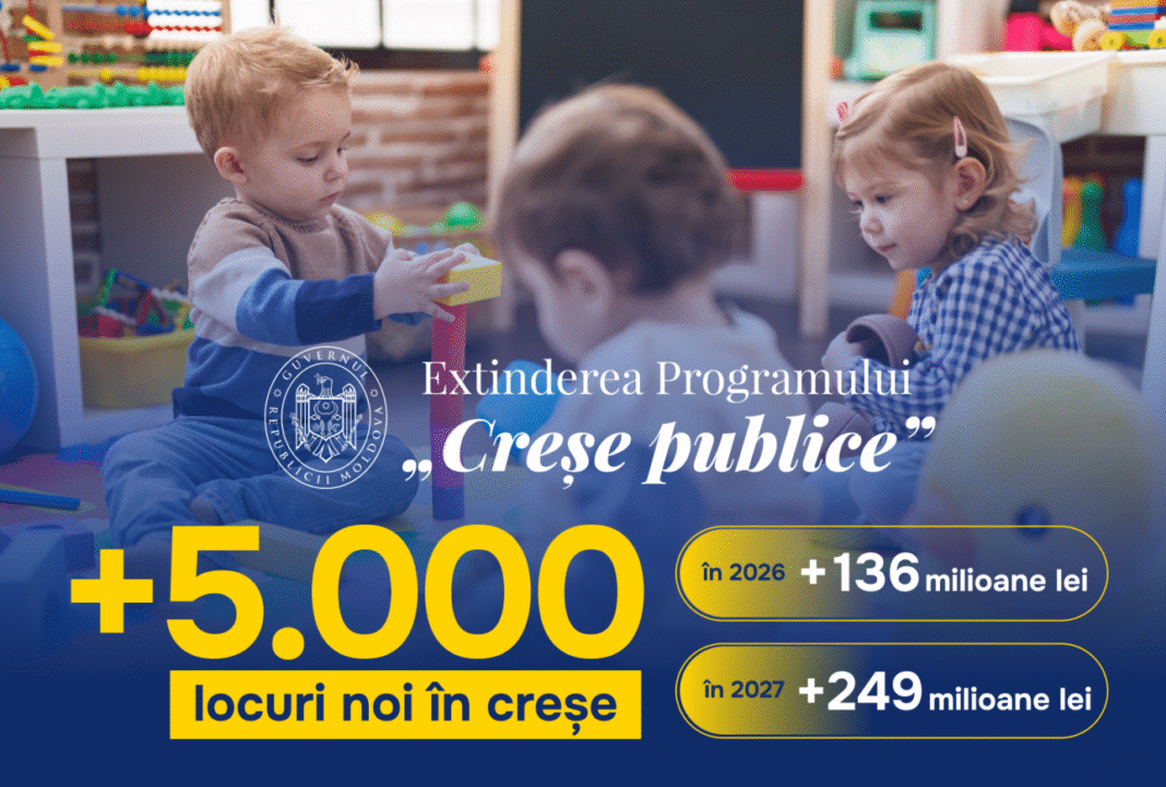 Guvernul Republicii Moldova va aloca 385,7 milioane de lei pentru extinderea creșelor în anii 2026-2027. Astfel, vor fi create până la 5000 de locuri de creșă, va fi finanțată extinderea grupelor existente și crearea unor grupe noi, inclusiv construcția anexelor. Lansarea noului apel de concurs în cadrul Programului Național „Servicii de creșe publice – Părinți angajați, copii la creșe”, a fost anunțat de Viceprim-ministrul, Ministrul Infrastructurii și Dezvoltării Regionale, Vladimir Bolea, și Ministra Muncii și Protecției Sociale, Natalia Plugaru.