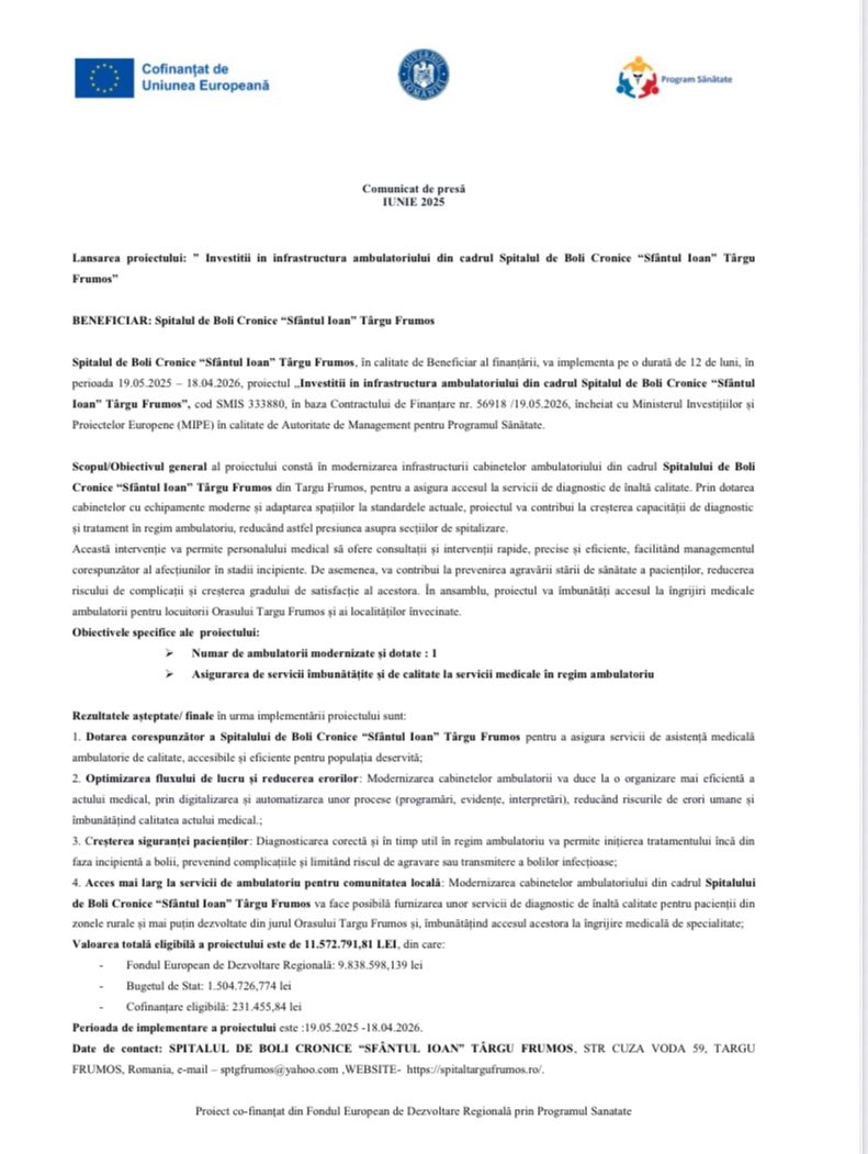 Spitalul de Boli Cronice “Sfântul Ioan” Târgu Frumos, în calitate de Beneficiar al finanțării, va implementa pe o durată de 12 de luni, în perioada 19.05.2025 – 18.04.2026, proiectul „Investitii in infrastructura ambulatoriului din cadrul Spitalul de Boli Cronice “Sfântul Ioan” Târgu Frumos”, cod SMIS 333880, în baza Contractului de Finanțare nr. 56918 /19.05.2026, încheiat cu Ministerul Investițiilor și Proiectelor Europene (MIPE) în calitate de Autoritate de Management pentru Programul Sănătate.