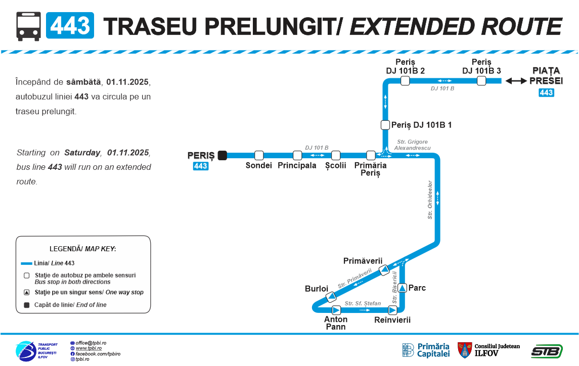 Începând de sâmbătă, 01.11.2025, autobuzele liniei 443 vor circula pe un traseu prelungit pe sensul spre „Piața Presei”, de la actualul capăt, „Periș”, pe Str. Grigore Alexandrescu, Str. Orhideelor, Str. Primăverii, Str. Sf. Ștefan, cu întoarcere pe Str. Bisericii, Str. Orhideelor, Str. Grigore Alexandrescu. Astfel, de sâmbătă, traseul liniei 443 va fi următorul: Pe sensul […]