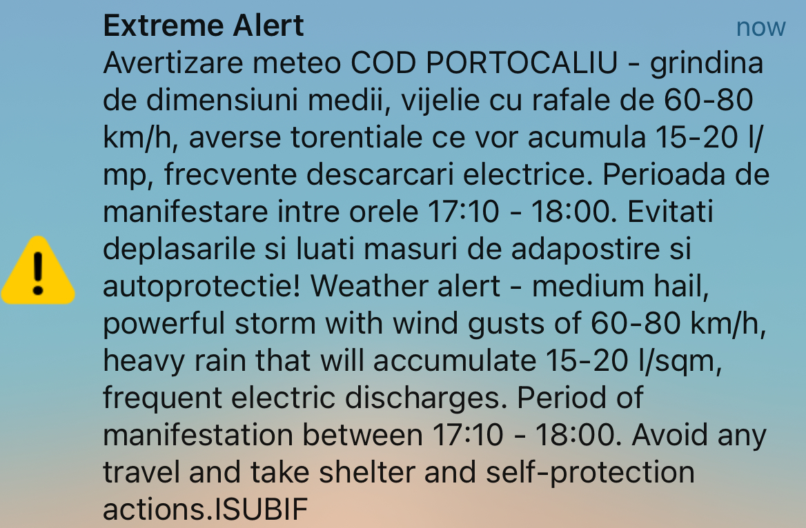 Un mesaj RO-Alert a fost primit joi după-amiază de bucuresteni, care anunta un Cod Portocaliu de grindina de dimensiuni medii, vijelie cu rafale de 60-80 km/h, averse torentiale ce vor acumula 15-20 l/ mp, frevente descarcari electrice. Perioada de manifestare intre orele 17:10 – 18:00. „Evitati deplasarile si luati masuri de adapostire si autoprotectie”, transmite […]