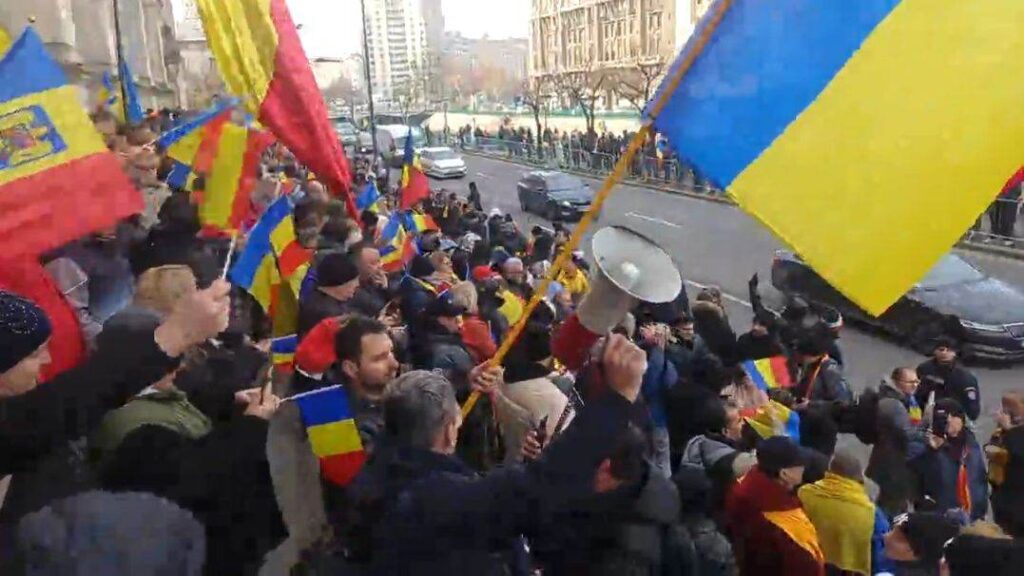 „Dreptate vrem!”, strigă în cor cei peste 2000 de oameni care s-au strâns în fața Curții de Apel București pentru a-și arăta susținerea pentru Călin Georgescu, președintele ales.