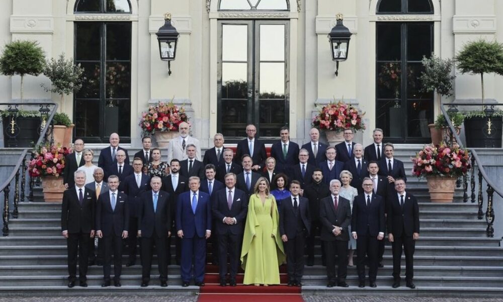 „Agentia News.ro titrează: ”Nicuşor Dan a stat lângă Mark Rutte, în spatele lui Donald Trump şi al regelui Willem-Alexander, la poza de familie de la summitul NATO. După şedinţa foto, preşedintele României a schimbat câteva cuvinte cu suveranul olandez”.