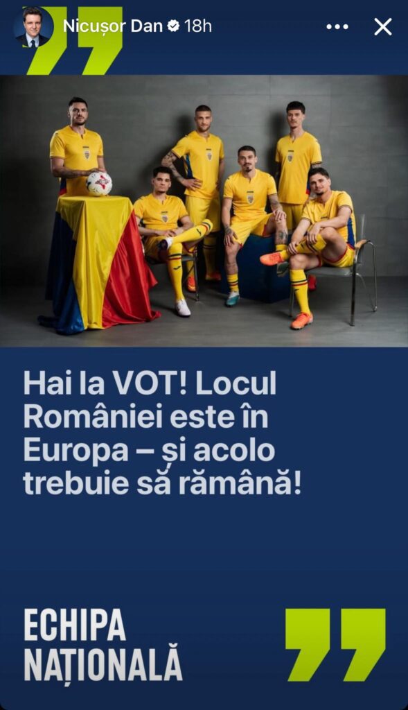 Jurnalista Anca Alexandrescu a preluat o captură distribuită inițial de realizatorul Ionuț Cristache. Astfel, potrivit unei imagini publicate la „story” de Nicușor Dan, echipa națională de fotbal a României îl susține pe candidatul independent la alegerile de duminică.