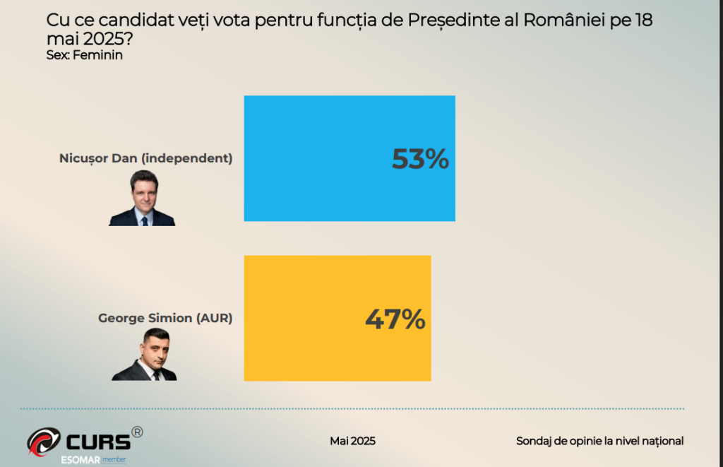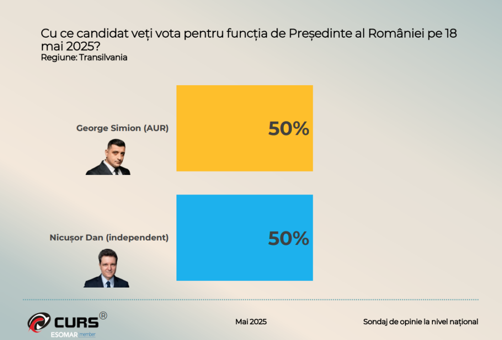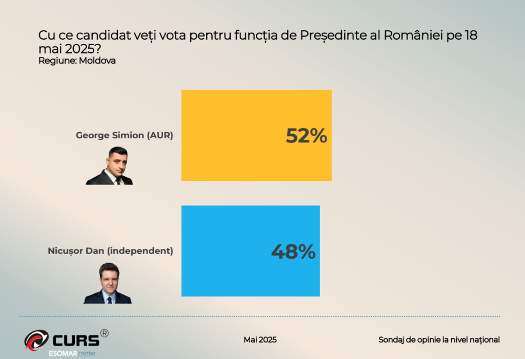 Un sondaj realizat de CURS (Centrul de Sociologie Urbană și Regională) în perioada 8–11 mai 2025 arată că George Simion (AUR) este creditat cu 52% din intențiile de vot, iar Nicușor Dan (candidat independent) cu 48%, înaintea turului al doilea al alegerilor prezidențiale programat pentru 18 mai.