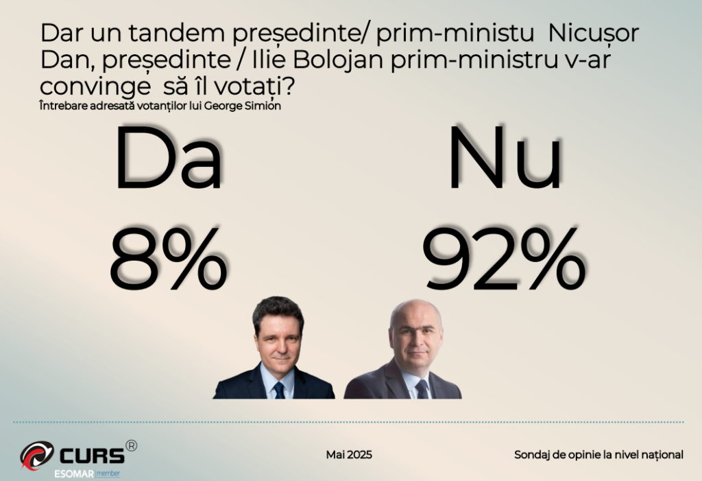 Sondajul a testat și un posibil tandem Nicușor Dan (președinte) – Ilie Bolojan (prim-ministru), în rândul votanților lui George Simion. Doar 8% dintre aceștia au declarat că ar fi convinși să își schimbe opțiunea de vot în favoarea acestui tandem, în timp ce 92% rămân fideli lui George Simion.