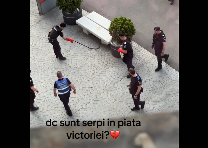 Panică în Piața Victoriei: Un șarpe a fost descoperit pe stradă și capturat de opt jandarmi / VIDEO