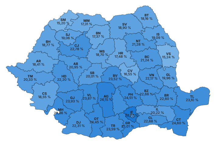 Prezența la urne este de 24,3% la nivel național, la ora 13.00. Județele fruntașe sunt cele din sudul țării