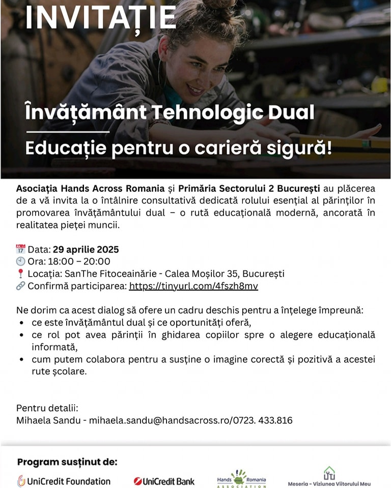 Primăria Sectorului 2 îi invită pe părinți să descopere beneficiile învățământului dual, un model educațional modern care îmbină pregătirea teoretică cu cea practică, oferind tinerilor un start solid în carieră. 📅 Când: 29 aprilie 2025, între orele 18:00 – 20:00📍 Unde: SanThe Fitoceainărie, Calea Moșilor 35, București Învățământul dual le oferă copiilor șansa de a […]