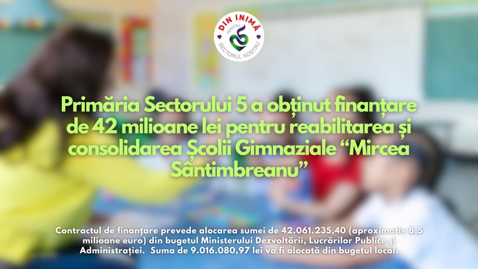 The post Primăria Sectorului 5 obține finanțare de 42 milioane lei pentru reabilitarea Școlii Gimnaziale Mircea Sântimbreanu appeared first on News Bucuresti.