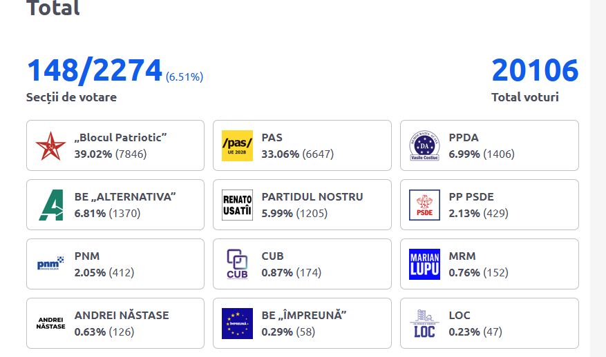 Primele rezultate parțiale la alegerile din Rep Moldova: Blocul Patriotic și PAS (Partidului Acțiune și Solidaritate), pe primele locuri