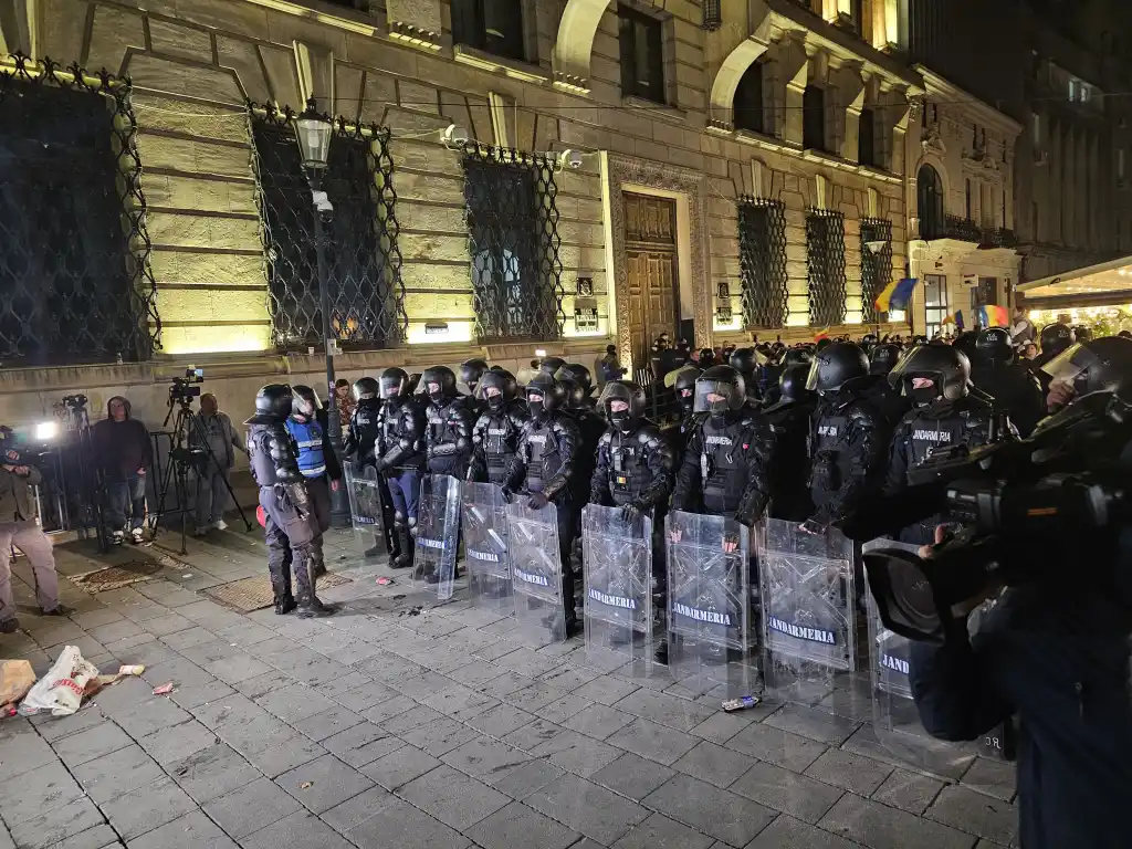UPDATE 22:03 – Tensiunile au ajuns la cote maxime, din mulțime se aruncă în coloana de jandarmi cu diverse obiecte. Forțele de ordine intervin, potrivit Realitatea PLUS. Scutierii au venit dotați cu gaze lacrimogene.