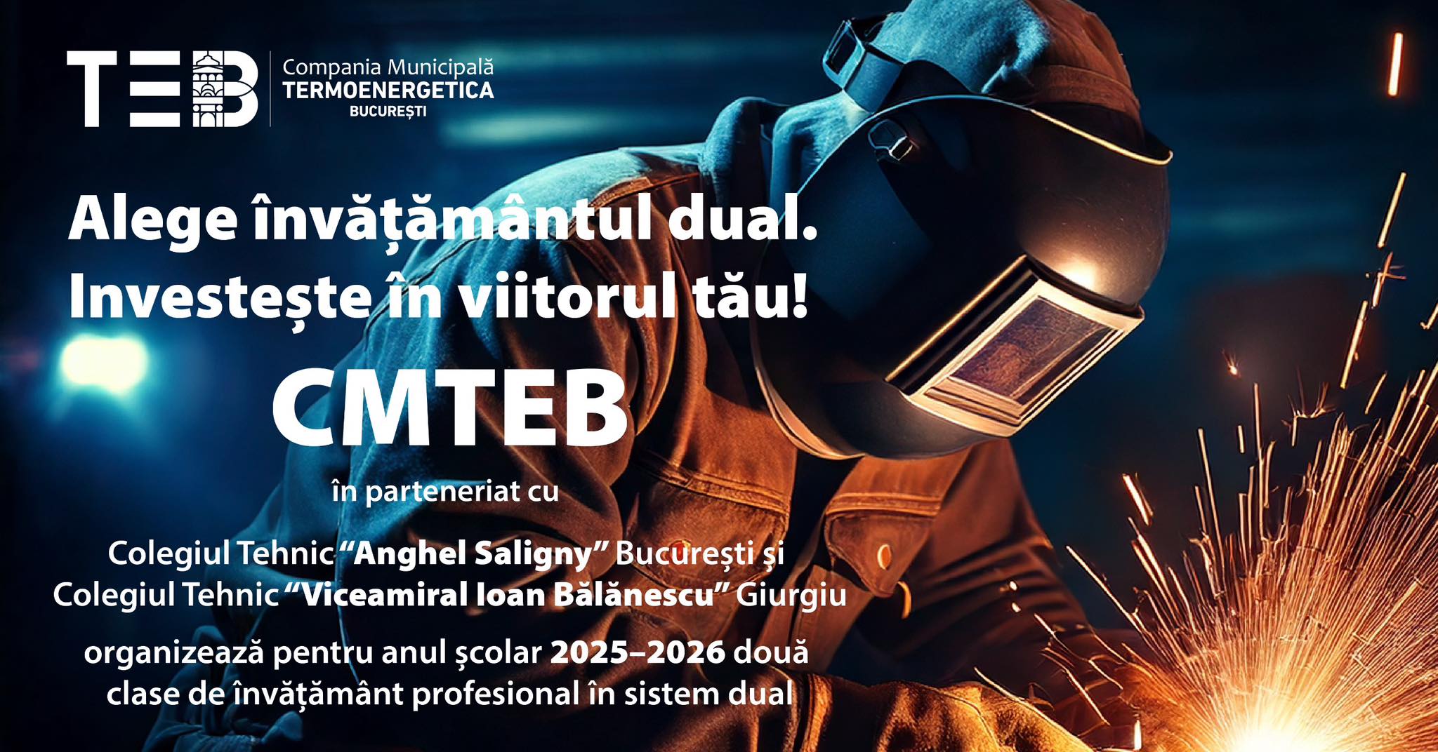Compania Municipală Termoenergetica București S.A., în parteneriat cu Colegiul Tehnic “Anghel Saligny” București și Colegiul Tehnic “Viceamiral Ioan Bălănescu” Giurgiu, organizează pentru anul școlar 2025–2026 două clase de învățământ profesional în sistem dual, pentru calificările: sudor și instalator instalații de încălzire centrală. Absolvenții clasei a VIII-a pot opta pentru această formă de învățământ, care le […]
