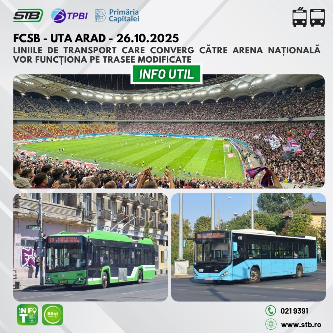 Ca urmare a desfășurării partidei de fotbal dintre FCSB și UTA Arad pe Arena Națională, duminică, 26.10.2025, STB anunță posibilitatea modificării traseelor troleibuzelor liniilor 86, 90 și autobuzelor liniilor 104, 143 în situația în care circulația rutieră va fi restricționată în zonă, astfel: Linia 86 va funcționa pe traseul de bază între terminalul „Clăbucet” și intersecția Str. Vatra Luminoasă/Str. Tony Bulandra, apoi pe un traseu modificat în ambele sensuri […]