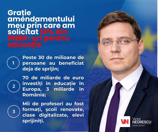 Europarlamentarul PSD Victor Negrescu declară că a propus și a obținut ca 10% din planurile de redresare ale fiecărei țări europene să meargă direct către educație, arătâns că nu a fost ușor. Peste 70 de miliarde de euro sunt investiți în educație în Europa, datorită propunerii mele, mai declară Negrescu.