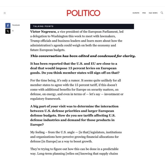 Europarlamentarul PSD Victor Negrescu a acordat un interviu pentru Politico.com în contextul vizitei oficiale pe care a condus-o la Washington în numele Parlamentului European, unde s-a discutat despre bugetele europene și impactul noilor măsuri comerciale propuse de SUA.